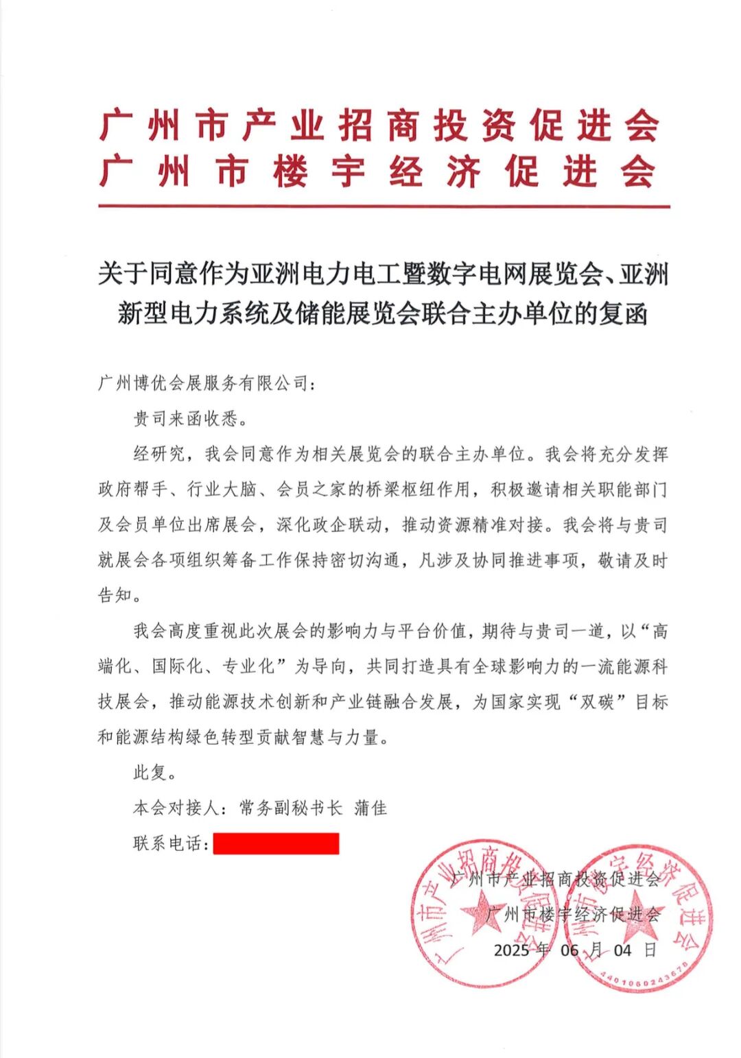 2025年6月5日,广州市产业招商投资促进会、广州市楼宇经济促进会复函同意成为亚洲电力电工暨数字电网展览会、亚洲新型电力系统及储能展览会(简称“亚洲电力展储能展”)联合主办单位。双促会将充分发挥政府帮手、行业大脑、会员之家的桥梁枢纽作用,积极邀请相关职能部门及会员单位出席展会,深化政企联动,推动资源精准对接,联合社会各方资源,积极推动能源技术创新和产业链融合发展,为国家实现“双碳”目标和能源结构绿色转型贡献智慧与力量。